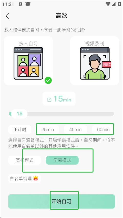 用户可以自行设置自习时长,挑选合适的监督模式,点击“开始自习”按钮就能开启学习。