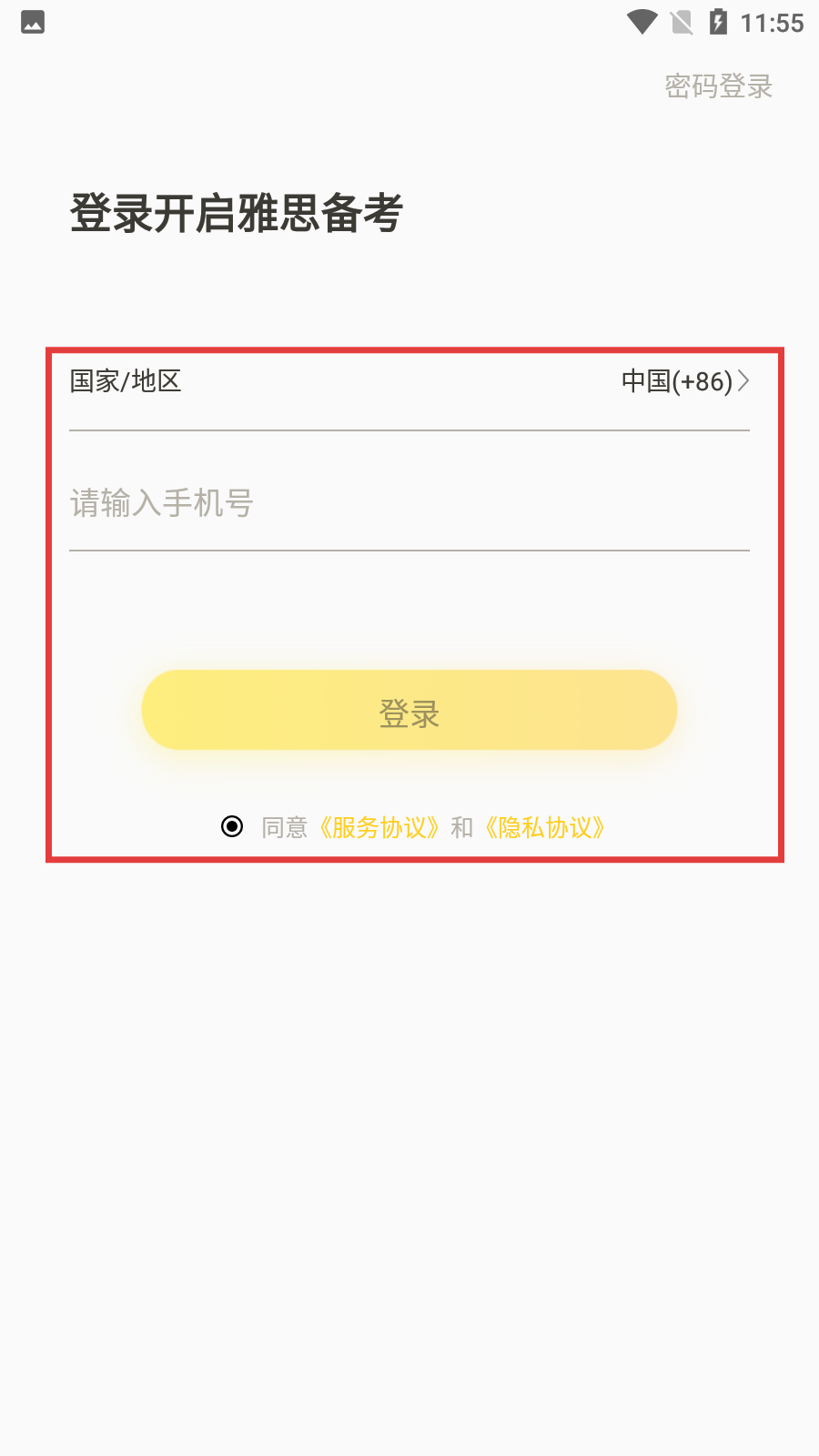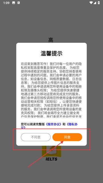 1、启动雅思写作应用,在弹出的温馨提示界面点击【同意】选项,随后进入登录界面。