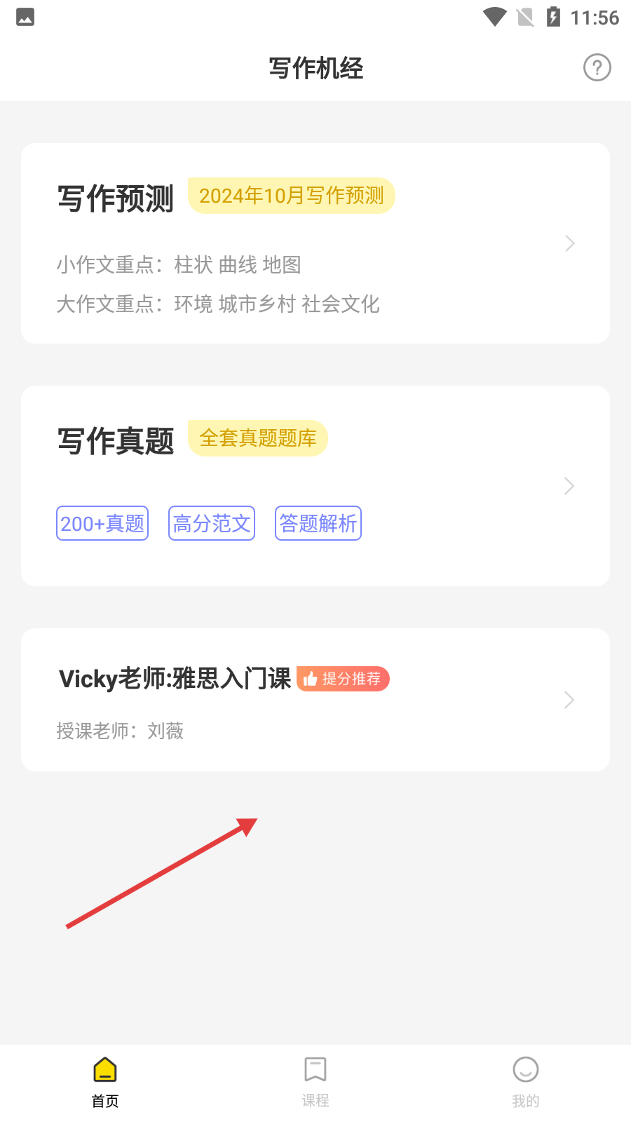 4、登录系统进入首页后,能够查看写作预测、写作真题以及相关课程,例如Vicky老师的雅思入门课。