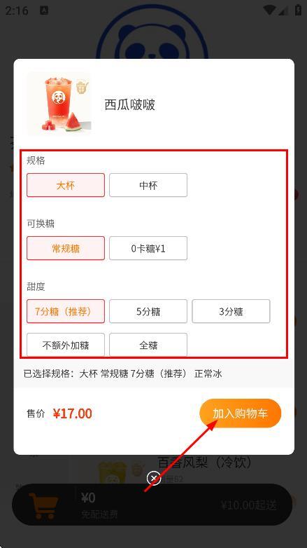 4、选好规格后,点击“加入购物车”按钮,把该饮品添加到购物车中。