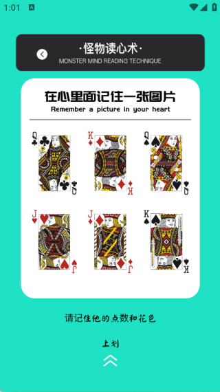 2、点击“怪物读心术”进入游戏,先记住牌的点数与花色,再向上滑动屏幕完成体验;