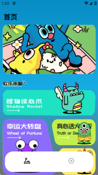 1、首页里设有怪物读心术、幸运大转盘、真心话大冒险这类游戏;