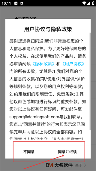 打开【扫码通】后,会弹出【用户协议与隐私政策】的弹窗,点击【同意并继续】按钮即可进入软件的主界面。