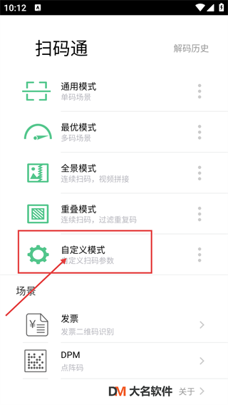 2、在软件主界面选择【自定义模式】选项,即可进入扫码参数的自定义设置页面,从而适配不同的扫码场景。