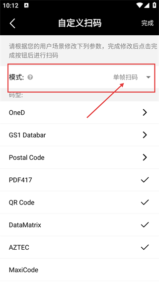 4、在模式下拉菜单中,可选择【单帧扫码】【重叠扫码】【全景扫码】等模式,以匹配对应的扫码需求。