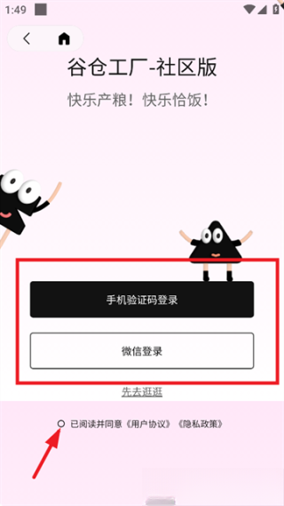 2.你会进入到登录页面,咱们选用手机号登录的方式吧,记得向下滑动页面,可别忘记勾选用户协议和隐私政策哦!