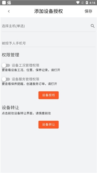 3、接着选择对应的主机,输入被授权人的手机号码,点击保存按钮就完成了。
