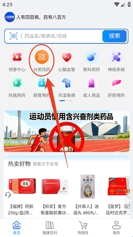 1、大家进入软件首页后,点击页面上的“分类找药”选项。