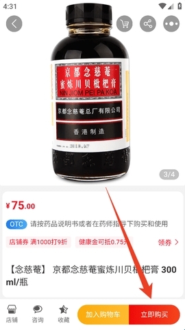 4、进入药物商品详情页后,点击右下角的“立即购买”按钮即可完成下单操作。