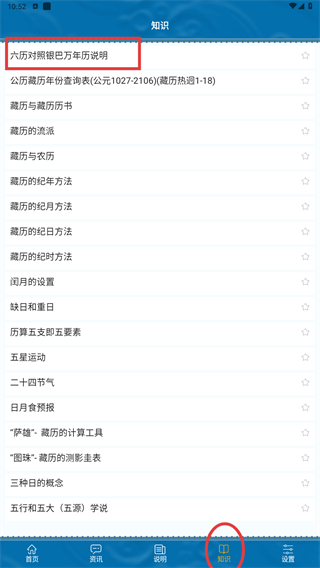 3、点击页面底部的【知识】按钮,进入知识页面后,即可查看“六历对照银巴万年历说明”等与藏历相关的知识条目列表。