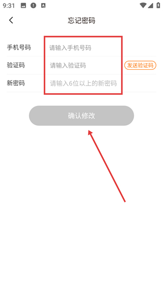 3、在忘记密码页面,按顺序填写【手机号码】,获取并输入【验证码】,设置6位及以上的新密码,之后点击【确认修改】按钮,即可完成密码重置操作。