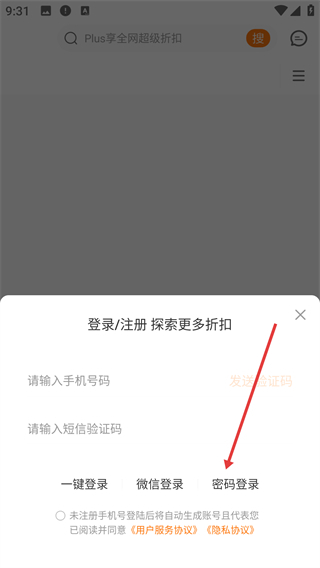 1、在登录/注册弹窗里,选择【密码登录】选项,就能切换到密码登录的操作界面,此时可使用账号和密码来完成登录。