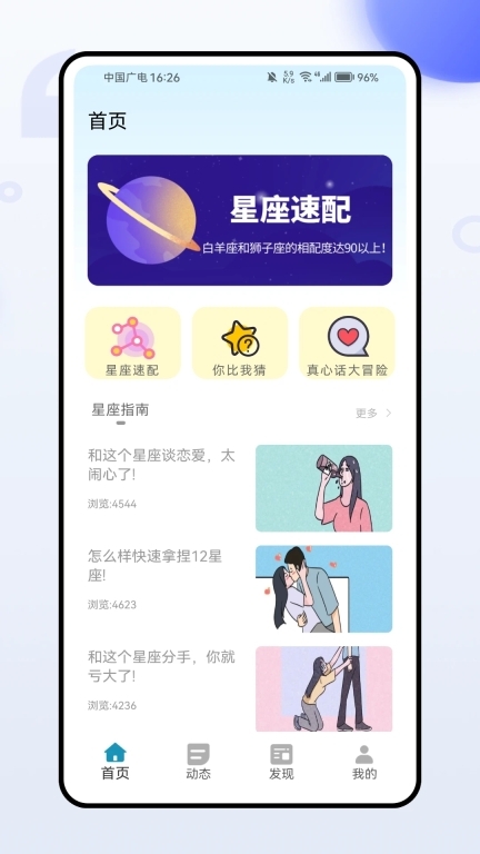 1、在首页能够了解星座速配、你比我猜以及真心知大冒险等相关内容的知识。