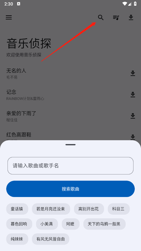 4、点击搜索按钮后,可通过歌曲名称或歌手名称来进行搜索。