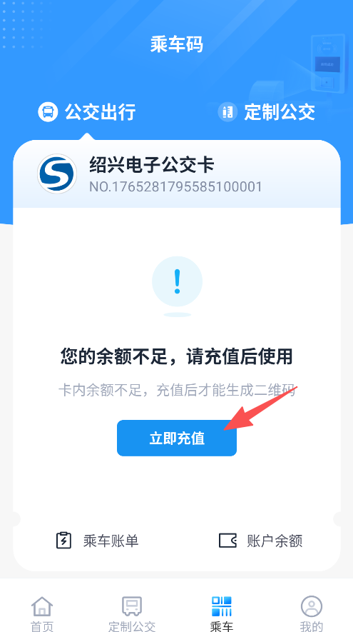 3、支持充值功能,当乘车码显示余额不足时,点击“立即充值”按钮即可完成绍兴电子公交卡的充值操作。