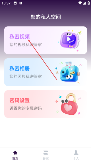 1、进入私人空间页面后,点击【秘密视频】这一选项,即可进入密码设置的操作界面。
