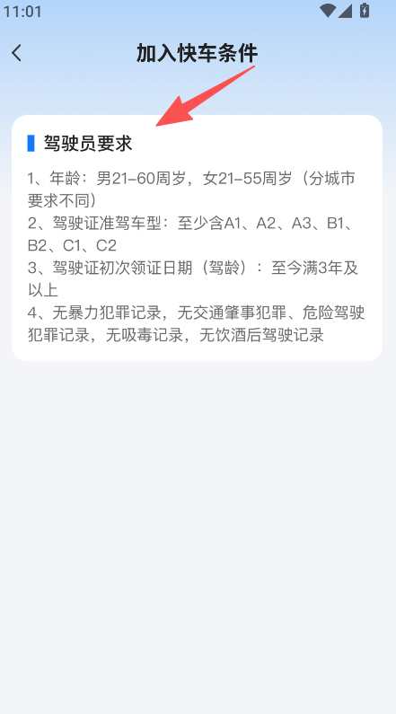 3、明确列出加入快车的驾驶员所需满足的条件,包括年龄、驾龄、车型等方面的限制要求,帮助车主提前知晓准入标准。
