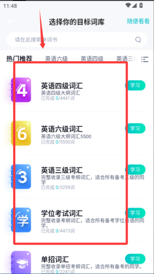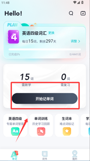1、打开应用后,先挑选想要学习的目标词库(比如四级词汇或高职单招词汇),接着设置好每天的学习量,就能开启记忆任务了。