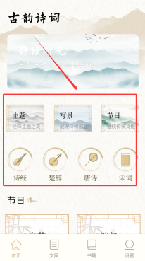 1、打开软件进入首页后,就能看到按主题(如写景、节日等)划分的分类导航选项啦。