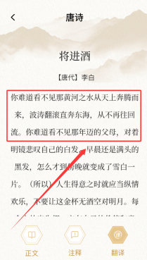 3、进入诗词阅读页面后,点击页面下方的注释或翻译按钮,即可查看详细的解析内容。