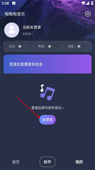 1、打开啦啦啦音乐应用,点击底部导航栏中的“我的”选项,即可进入个人中心页面。