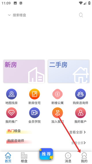 1. 在房产首页,能够选择【新房】【二手房】功能,点击底部的【我的】按钮,即可进入个人相关操作界面。