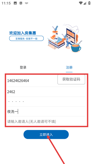4、在房集惠注册界面,填写手机号、验证码等信息后,点击【立即进入】,完成注册操作以使用服务。