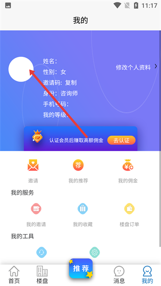 进入【我的】界面后,既能查看个人信息,也可以点击【修改个人资料】来编辑信息,此外还能进行认证会员的操作以获取佣金。
