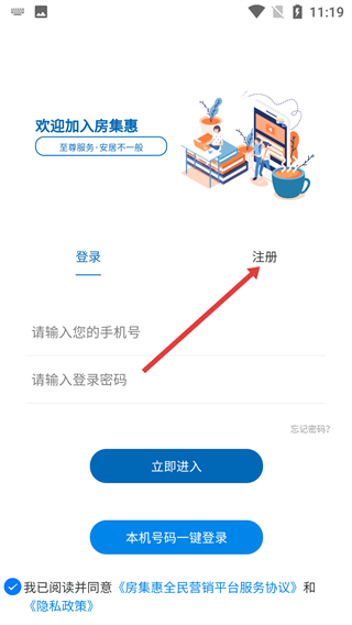 3、进入房集惠的登录界面后,点击【注册】按钮,页面会切换到注册界面,此时就可以开始准备填写注册时需要的各项信息了。