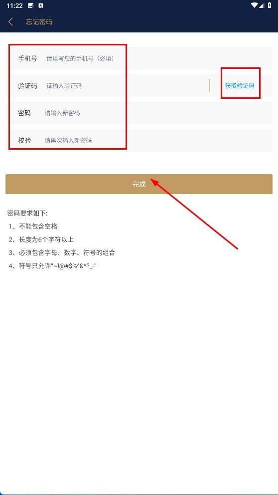 3、若不慎忘记密码,可点击“忘记密码”选项进入密码重置页面;接着填写注册时绑定的手机号,点击“获取验证码”按钮,待收到验证码后将其与新设置的密码一并输入,完成密码重置操作后点击“完成”即可。
