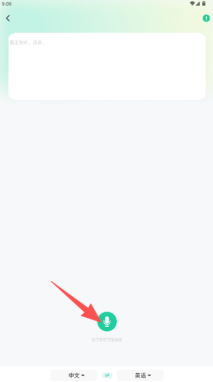 2、在语音翻译界面,按下中间的圆形麦克风按钮,随后清晰地说出要翻译的中文或英文内容即可启动翻译。