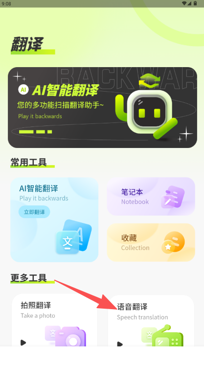 1、在应用首页的“更多工具”区域里找到“语音翻译”选项并点击,即可进入该功能模式。