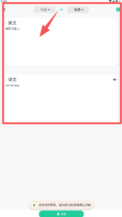 3、说话结束后,系统会自动进行识别,并展示出原文和译文;若要播放翻译结果,可点击译文右侧的扬声器图标。