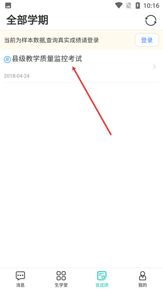 1、打开【生学堂(学生)】应用,在主界面点击底部导航栏的【查成绩】选项,进入成绩查询页面后,就能看到各类考试的成绩详情了。