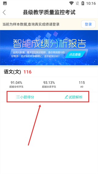 在考试成绩详情页面,点击【小题得分】或【试题解析】按钮,就能查看该科目各小题的得分情况,或者查看试题的详细解析。