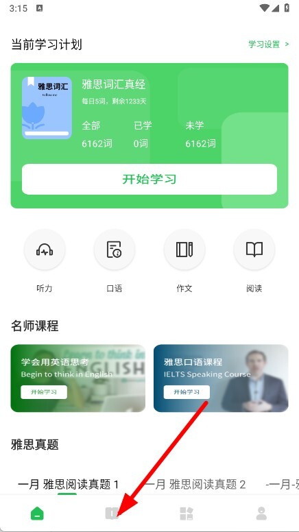 1、首先打开应用,接着点击底部导航栏正中间的课程图标,这样就能进入到课程页面了。