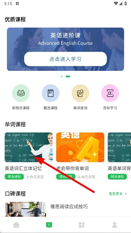 2、在课程页面的单词课程板块中,找到英语词汇立体记忆课程的卡片并点击它。