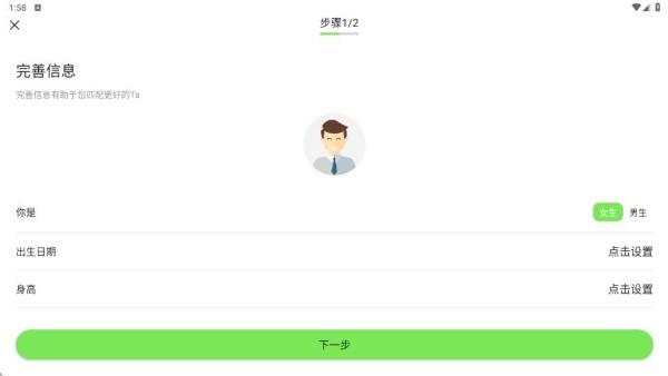 3、新用户需要完善个人信息,将身高、体重、年龄、星座、昵称等各类信息上传。