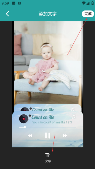 4、进入添加文字的页面后,点击【文字】按钮,添加好视频文字内容,再点击【完成】按钮,这样就可以完成整个操作流程了。