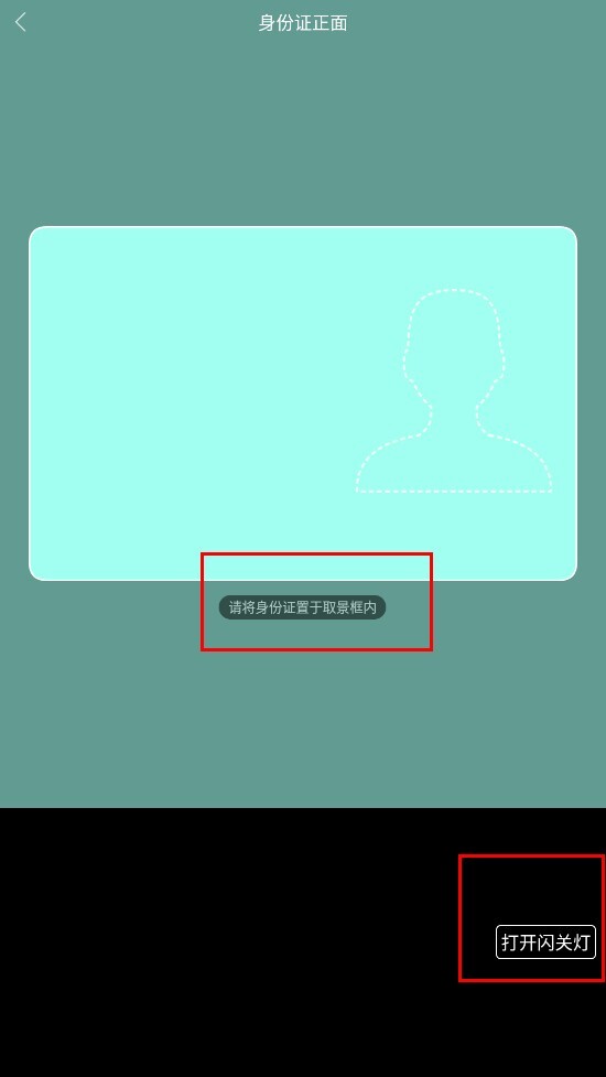4、把身份证放在取景框里,要是扫描不清晰,可以点击【打开闪光灯按钮】来辅助扫描。