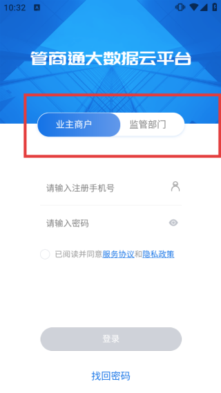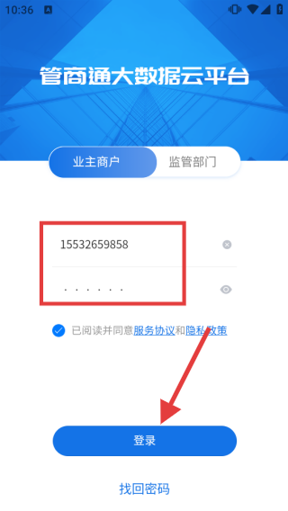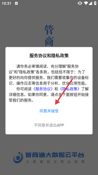 1、打开“管商通大数据云平台”,在协议弹窗点击【同意并接受】,接受服务协议和隐私政策。