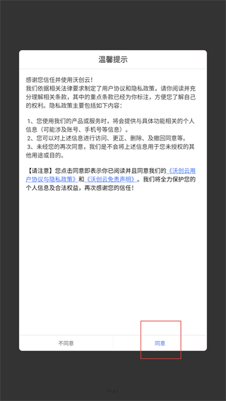 1、在阅读【沃创云】的用户协议和隐私政策后,点击【同意】按钮,以此确认接受相关条款,以便继续使用服务。