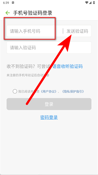 3、在手机号验证码登录页面,输入手机号码后,点击“发送验证码”按钮。