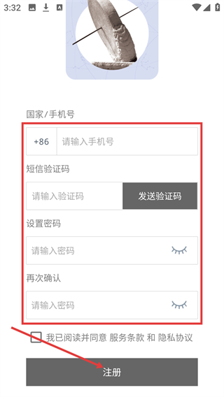 2、在注册页面按顺序填写【请输入手机号】【短信验证码】【设置密码】【再次确认】这几项信息,随后点击注册按钮,即可完成注册流程。
