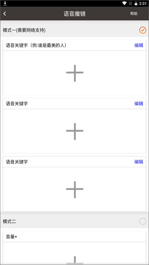 进入设置界面,录入语音指令和对应的照片。重启《语音魔镜》应用后,说出指定语音,说完后通过按音量上键或下键来显示对应的图片。