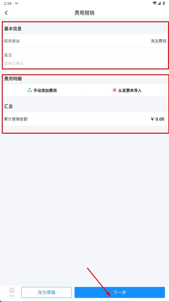 4、在费用报销填写页面,先依次完成【基本信息】的填写和【费用明细】的添加,确认所有内容无误后,点击页面底部的【下一步】按钮。
