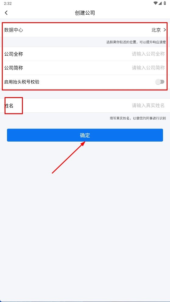 在创建公司页面,需依次填写【数据中心】【公司全称】【公司简称】【姓名】这些信息,确认所有内容无误后,点击页面底部的【确定】按钮,即可完成公司创建操作。
