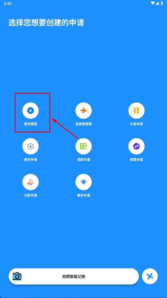 3、快速发起费用报销申请的方式是:在申请类型选择页面找到并点击【费用报销】图标,进入报销流程的具体填写环节即可。