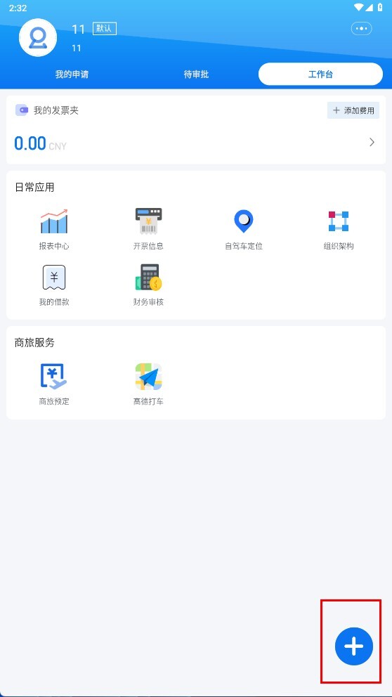 2、进入工作台界面后,找到右下角的【+】按钮并点击,展开包含多种功能的操作菜单,为后续选择报销类型做好准备。