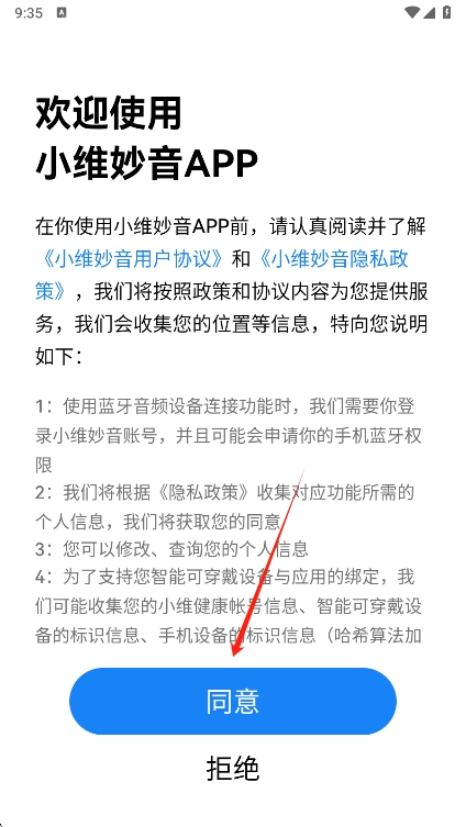 打开小维妙音后,在进入首页之前,需要先同意相关的用户协议。